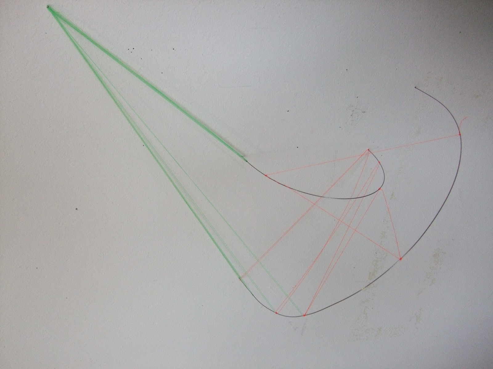 I made a circle of pins and perpendicular to this the bent wire came out of the wall. The idea was to create a hemisphere by using the Cartesian plane. The wire gave no friction to support the string.